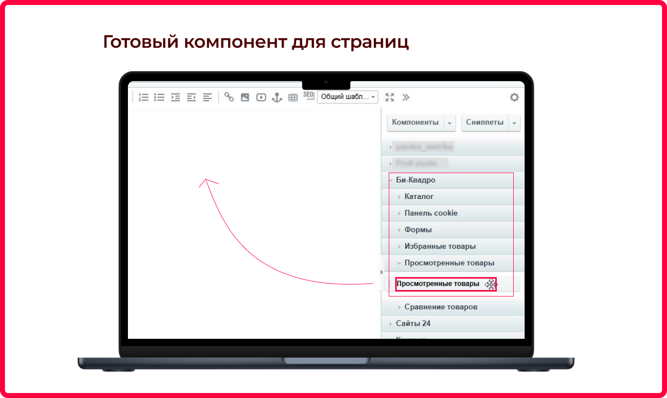 1. Разместите на странице компонент «bquadro.viewed: catalog.viewed», который находится по пути Би-Квадро → Просмотренные товары → Просмотренные товары.