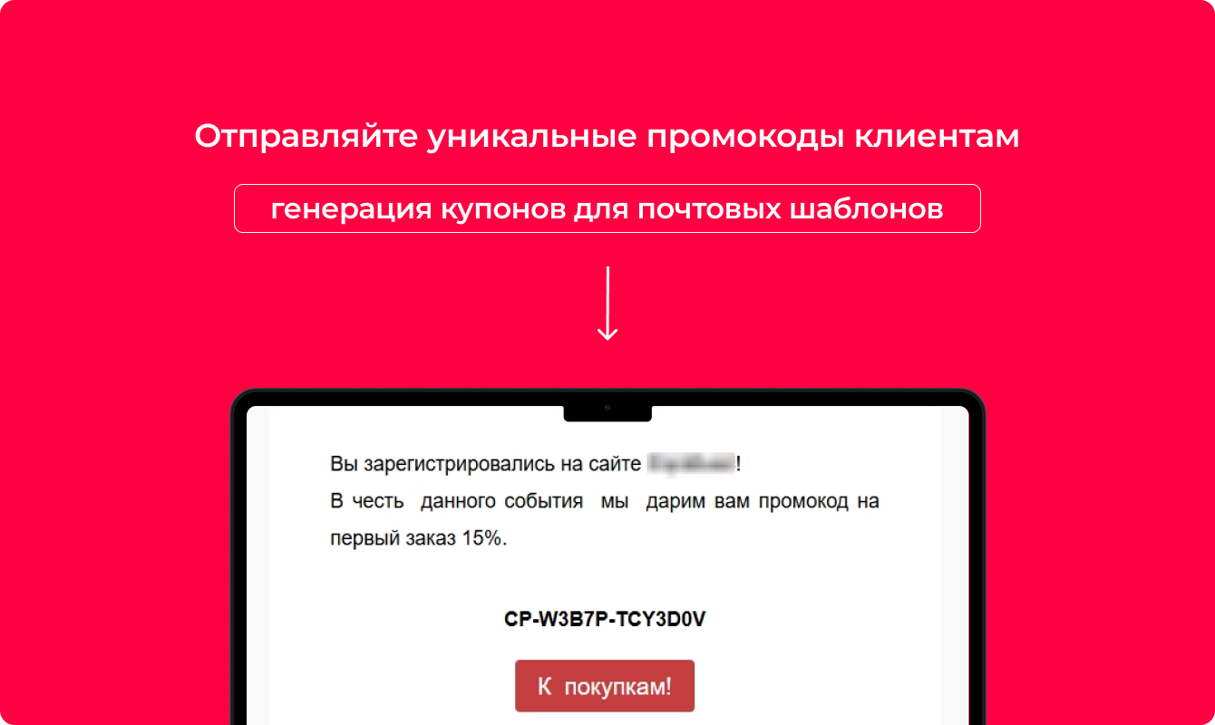 Модуль автоматически создает уникальные промокоды при отправке почтовых шаблонов. Он упрощает процесс подготовки и рассылки писем с кодами, обеспечивает их неповторимость и легко встраивается в любую маркетинговую кампанию.