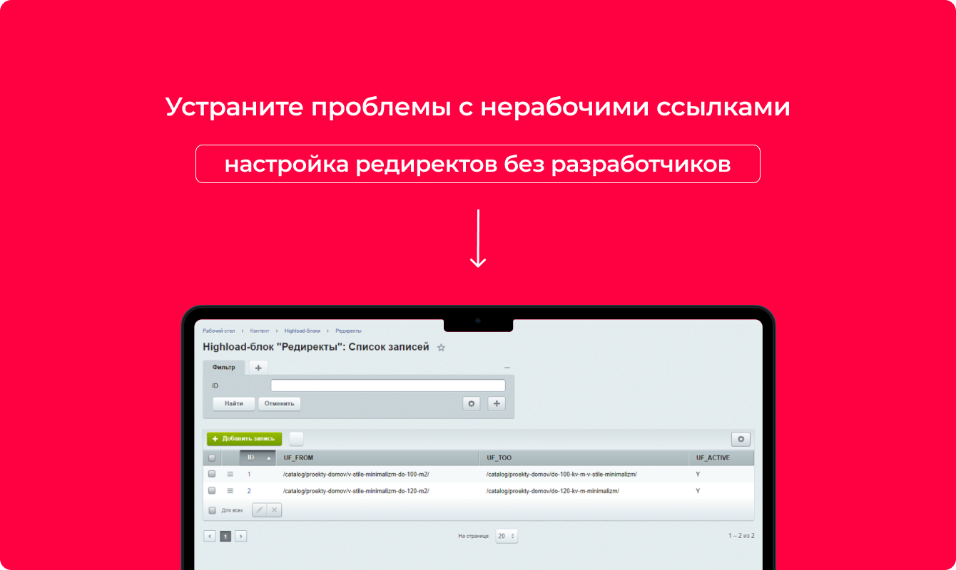 Решите проблемы с неработающими ссылками и улучшите пользовательский опыт с модулем SEO-редиректов от Bquadro. Этот удобный инструмент позволяет создавать и редактировать редиректы напрямую из административной панели сайта, без привлечения разработчиков.
