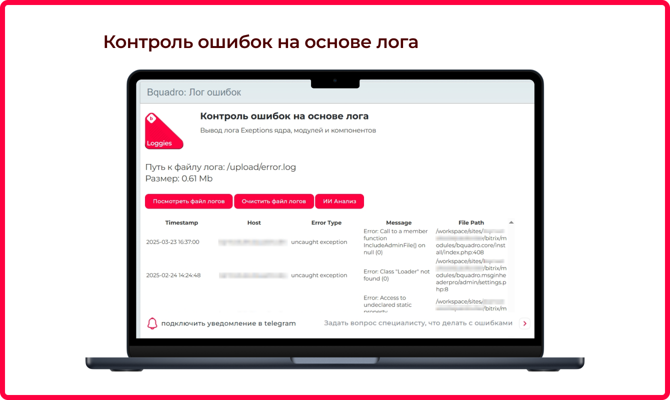 где в битриксе логи, нет ли там ошибок и как их исправить;