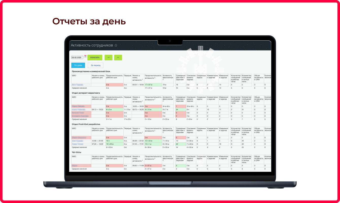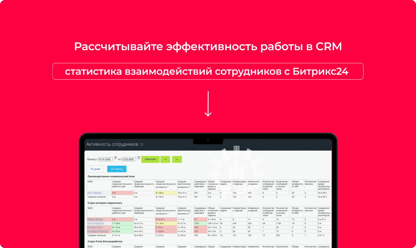 Модуль «Анализ активности сотрудников» помогает отслеживать взаимодействия работников с CRM за определённый день или временной промежуток.