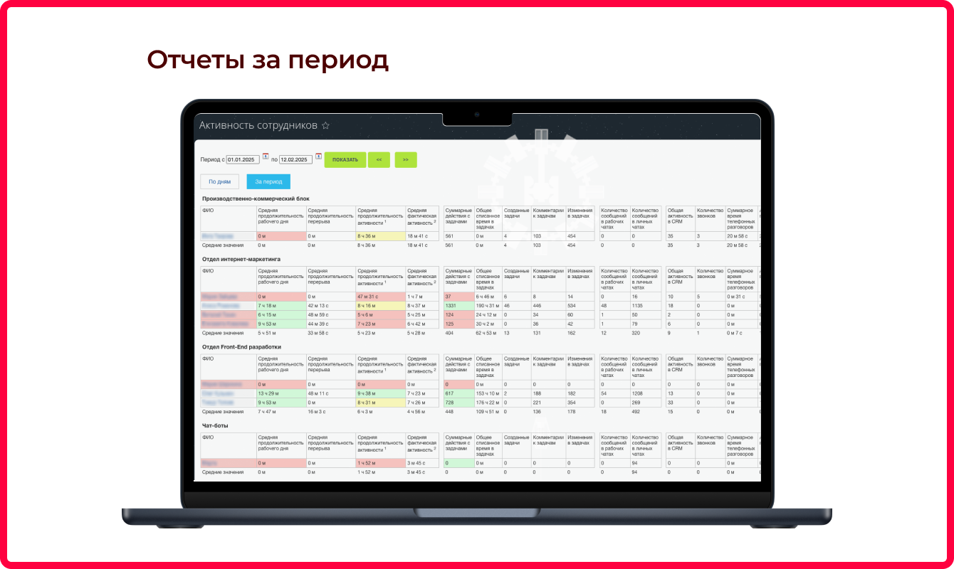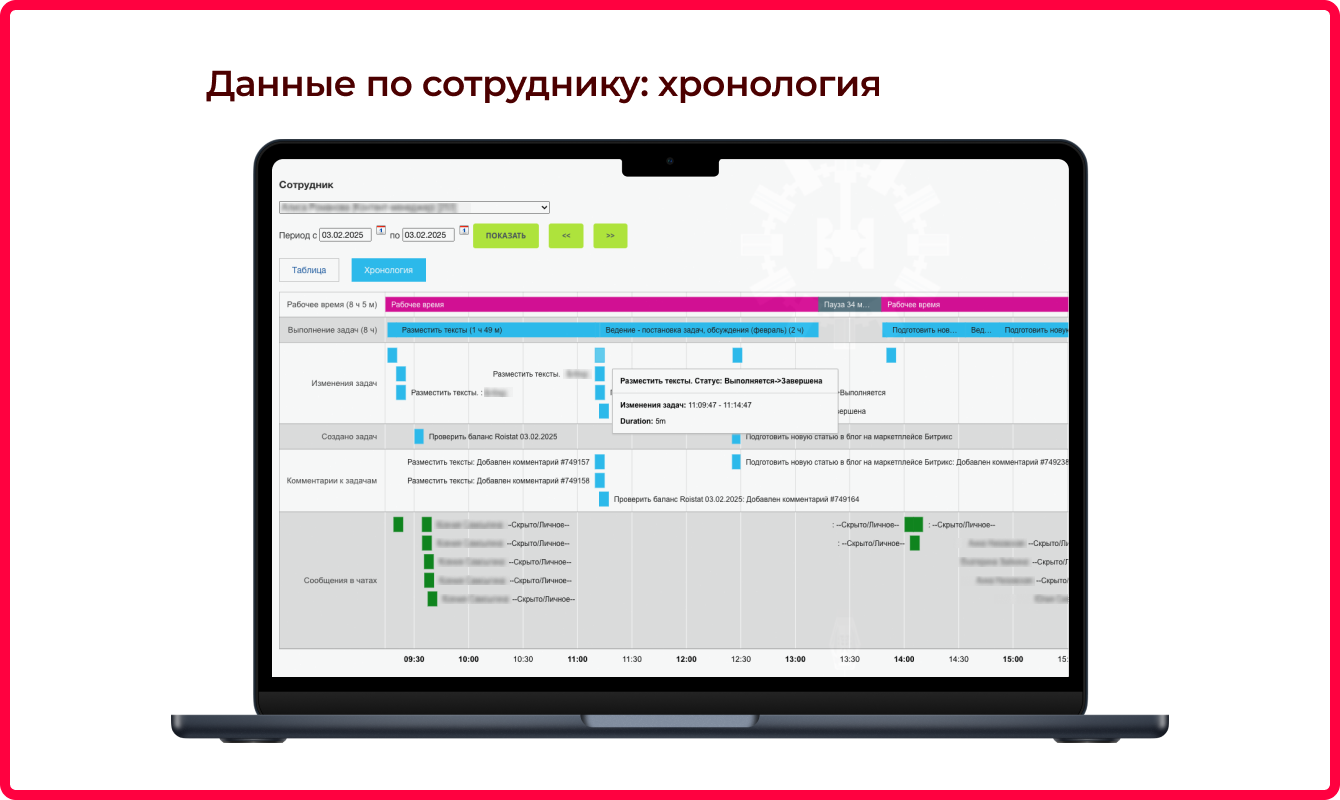 - Активность отдельных работников в виде таблиц и графиков с хронологией действий.