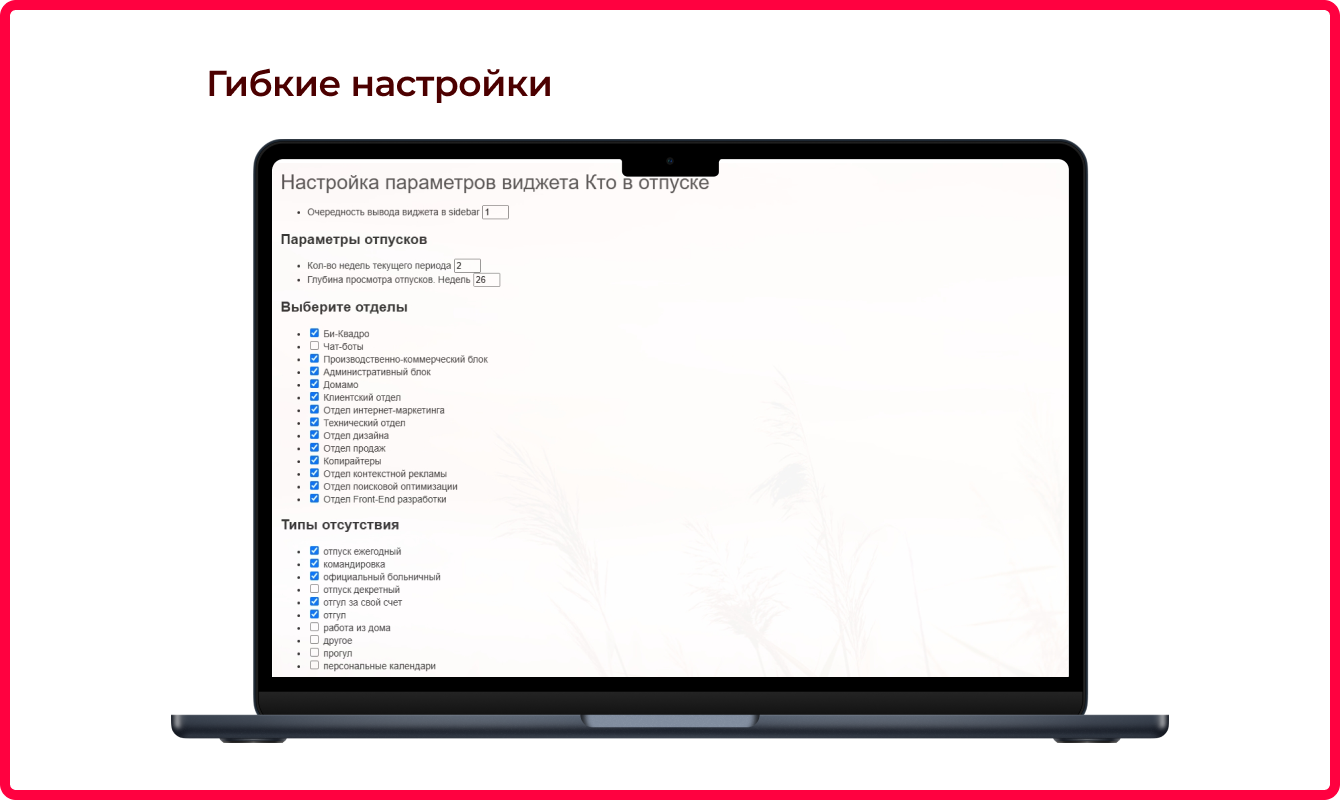 Инструмент состоит из двух настраиваемых блоков для лучшего разделения предстоящих отсутствий на ближайшие и отдаленные по времени.