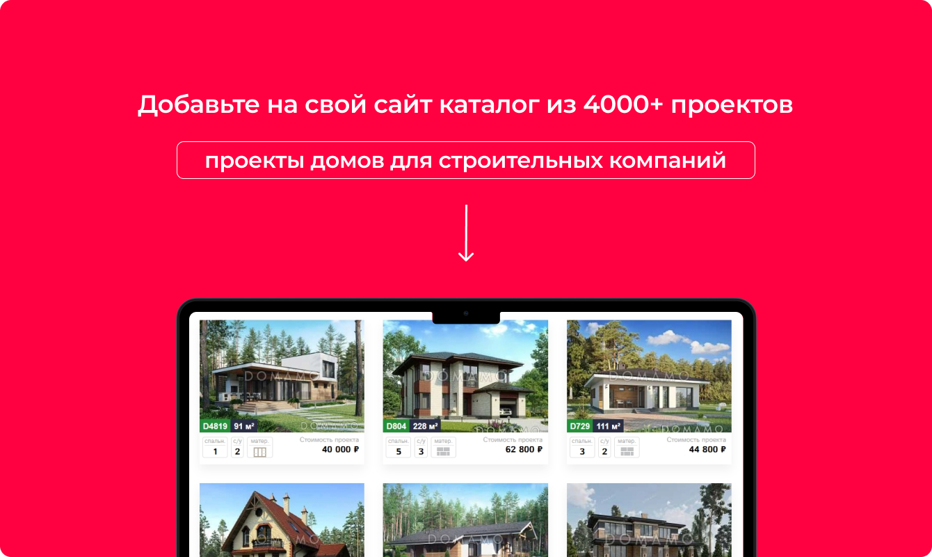 В этом случае модуль также выводит полный каталог проектов Domamo на выбранной странице вашего сайта, но значительно расширяются возможности для строительной компании. Вы сможете более избирательно показывать проекты, добавлять комплектации и стоимость строительства. Добавляются такие функции: